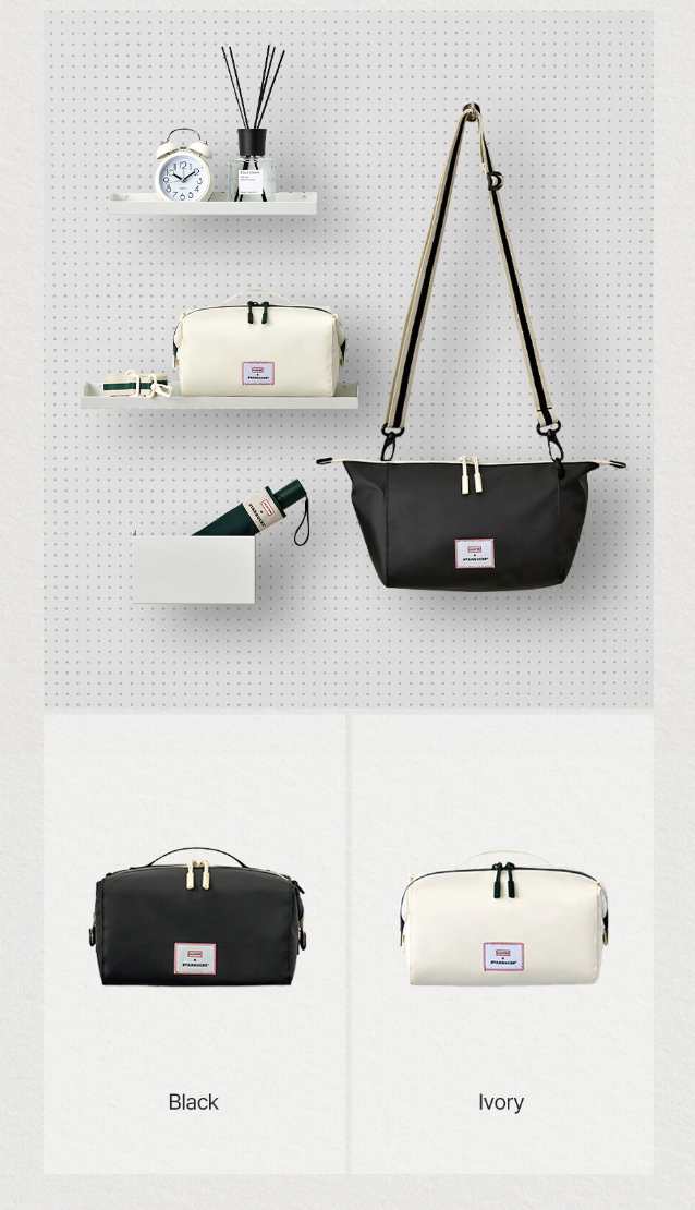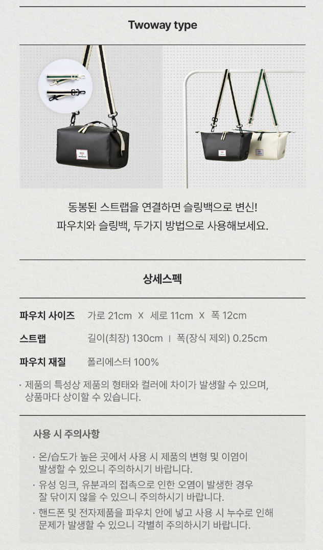 캐리어 안에서는 파우치로, 스트랩을 연결하면 슬링백이 되는 투웨이 파우치로 물품 보관과 휴대가 유용할 것 같은 아이템이다.