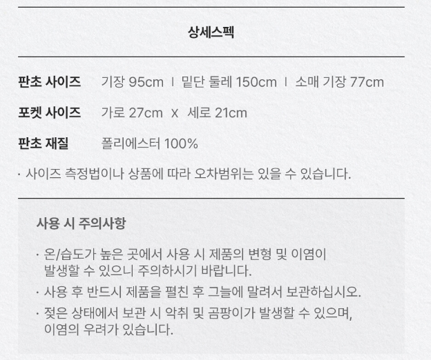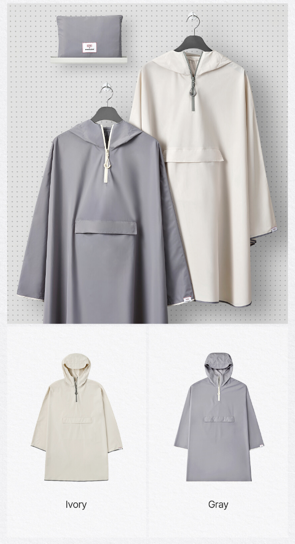 그레이와 베이지 2가지 색상의 판초가 공개되었고, 비 오는 날 가볍게 착용하기 좋을 것 같다.