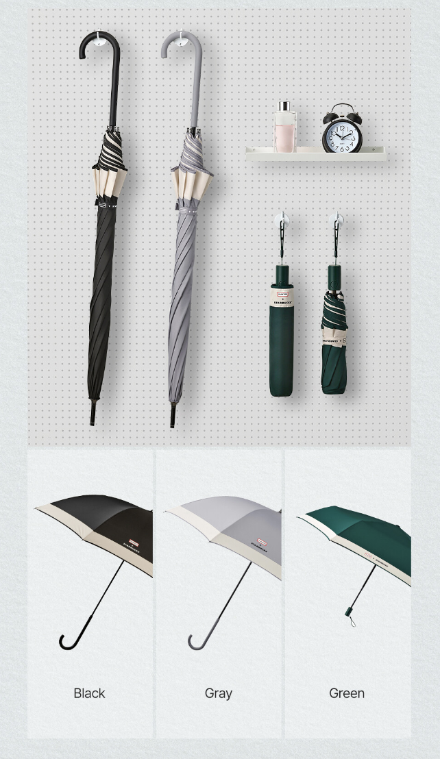 장대비가 쏟아지는 장마철에도 가볍고 튼튼하게 들 수 있는 라이트 장우산과 소나기도 걱정 없이 컴팩트한 라이트 폴딩 우산으로 여름비를 대비하기 좋을 것 같다. 장우산은 블랙, 그레이로 2종, 폴딩 우산은 스타벅스 메인 컬러인 그린색이 출시될 예정이다.