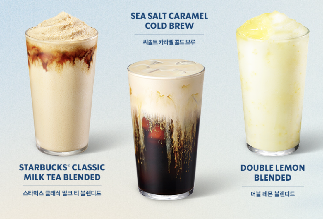 서머 프로모션 음료(씨솔트 카라멜 콜드브루, 스타벅스 클래식 밀크 티 블렌디드, 더블 레몬 블렌디드)/ 리저브 카테고리 음료/ 프라푸치노/ 블렌디드
