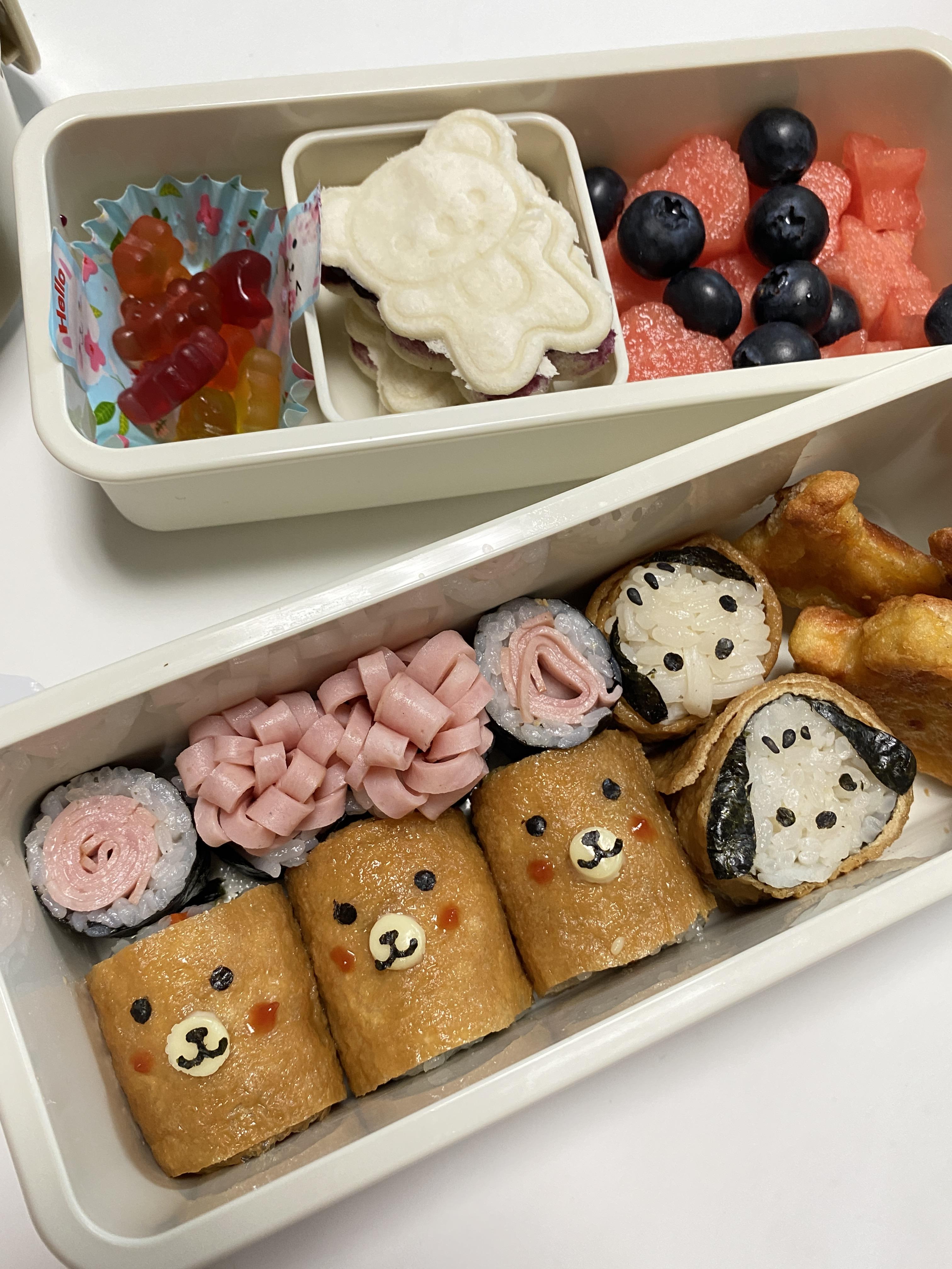 유부초밥, 김밥, 과일, 간식 등 초등학생 아이들이 먹기 좋은 양을 골고루, 다양하게 담아 데코까지 할 수 있었습니다.