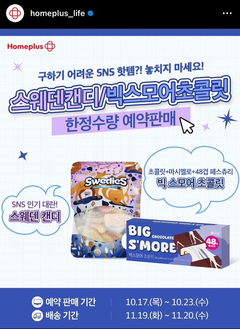 최근 SNS에서 큰 인기를 얻고 있는 스웨덴 캔디(스웨디시 젤리)와 빅 스모어 초콜릿을 홈플러스에서 한정 수량으로 예약 주문할 수 있습니다. 이 글에서 해당 제품들을 홈플러스에서 어떻게 예약 구매하는 방법에 대해 설명해 보겠습니다.