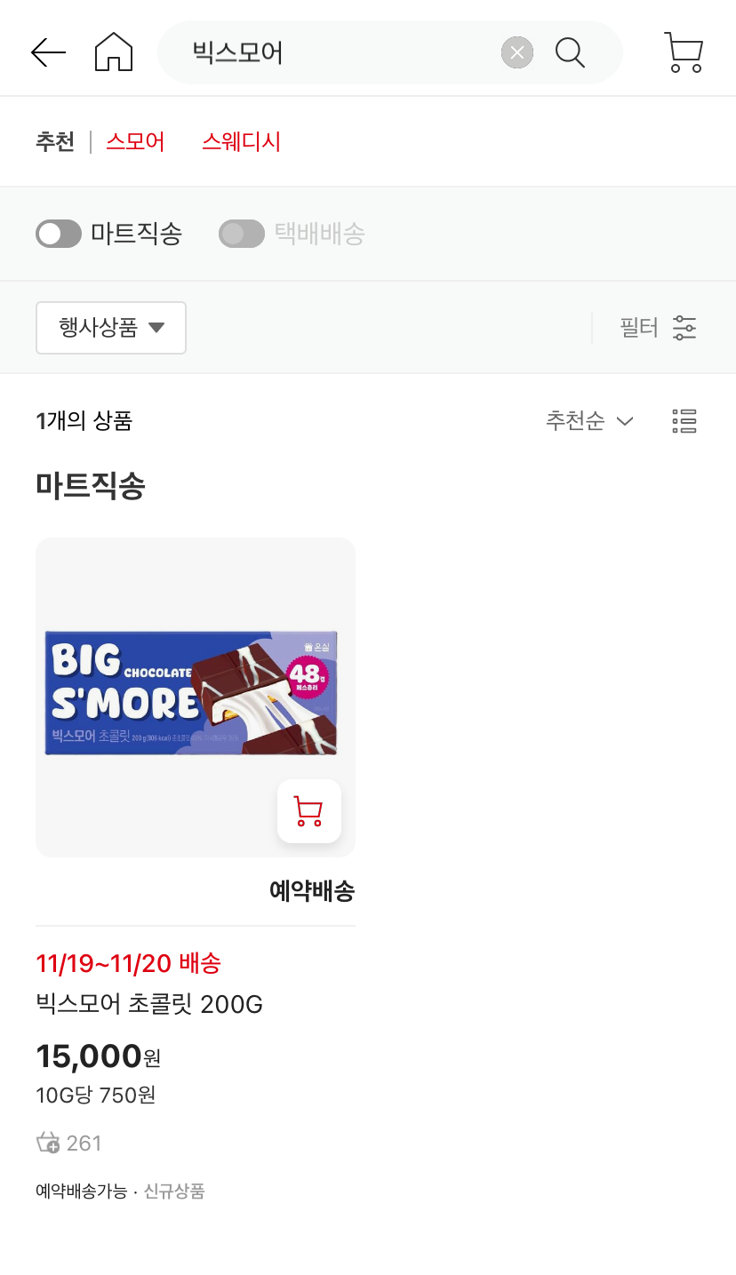 검색창에 "스웨디시 젤리" 또는 "빅 스모어 초콜릿"을 입력하여 검색합니다. 검색 후 관련 상품 목록에서 원하는 제품을 선택합니다.